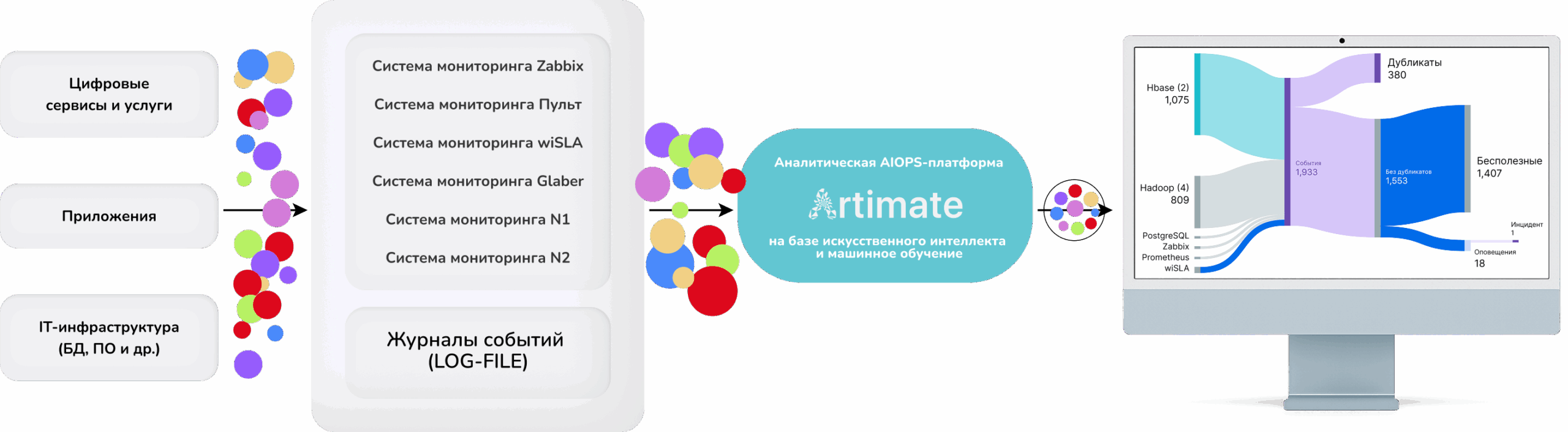 Artimate собирает данные со всех систем ИТ-мониторинга и превращает их в сформулированные инциденты с помощью ML-аналитики.