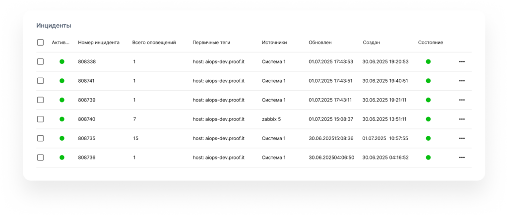 • Статус, состояние, даты создания и последнего обновления, легенда с количеством оповещений в инциденте в состояниях “Решен” и “Открыт”, фильтрация по оповещениям;