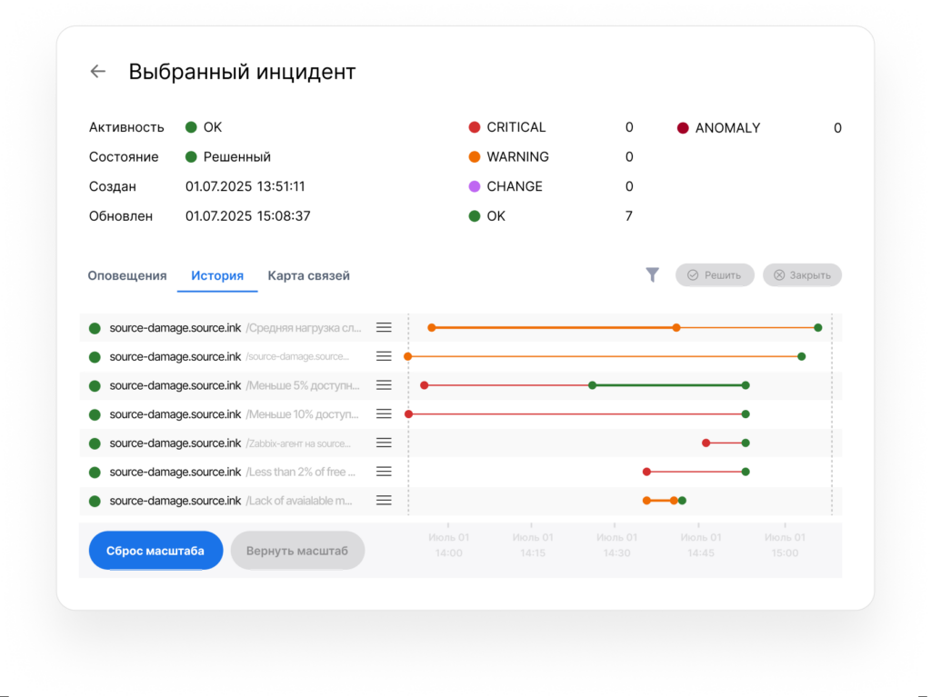 Платформа предлагает два режима работы со списком инцидентов. Онлайн-режим позволяет наблюдать за формированием инцидентов и их развитием в реальном времени, отфильтровывая уже закрытые события и снижая визуальный шум. Это помогает командам быстрее реагировать на текущие проблемы и концентрироваться на актуальных задачах. Архивный режим предназначен для анализа исторических данных по завершенным инцидентам, что полезно при проведении post-mortem анализа и выявлении повторяющихся паттернов сбоев.