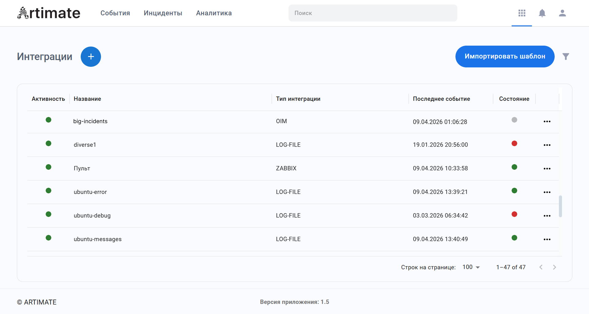 Artimate поддерживает готовые интеграции с Zabbix, wiSLA, Пульт, Astra monitoring, UDV ITM и другими популярными системами мониторинга. Список коннекторов постоянно пополняется.