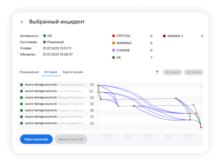 Кабинет инцидента предоставляет системным инженерам полный обзор каждого инцидента через удобный кабинет, где отображается хронология развития событий (таймлайн) и карта связей, показывающая, почему именно эти оповещения были объединены в текущий инцидент.