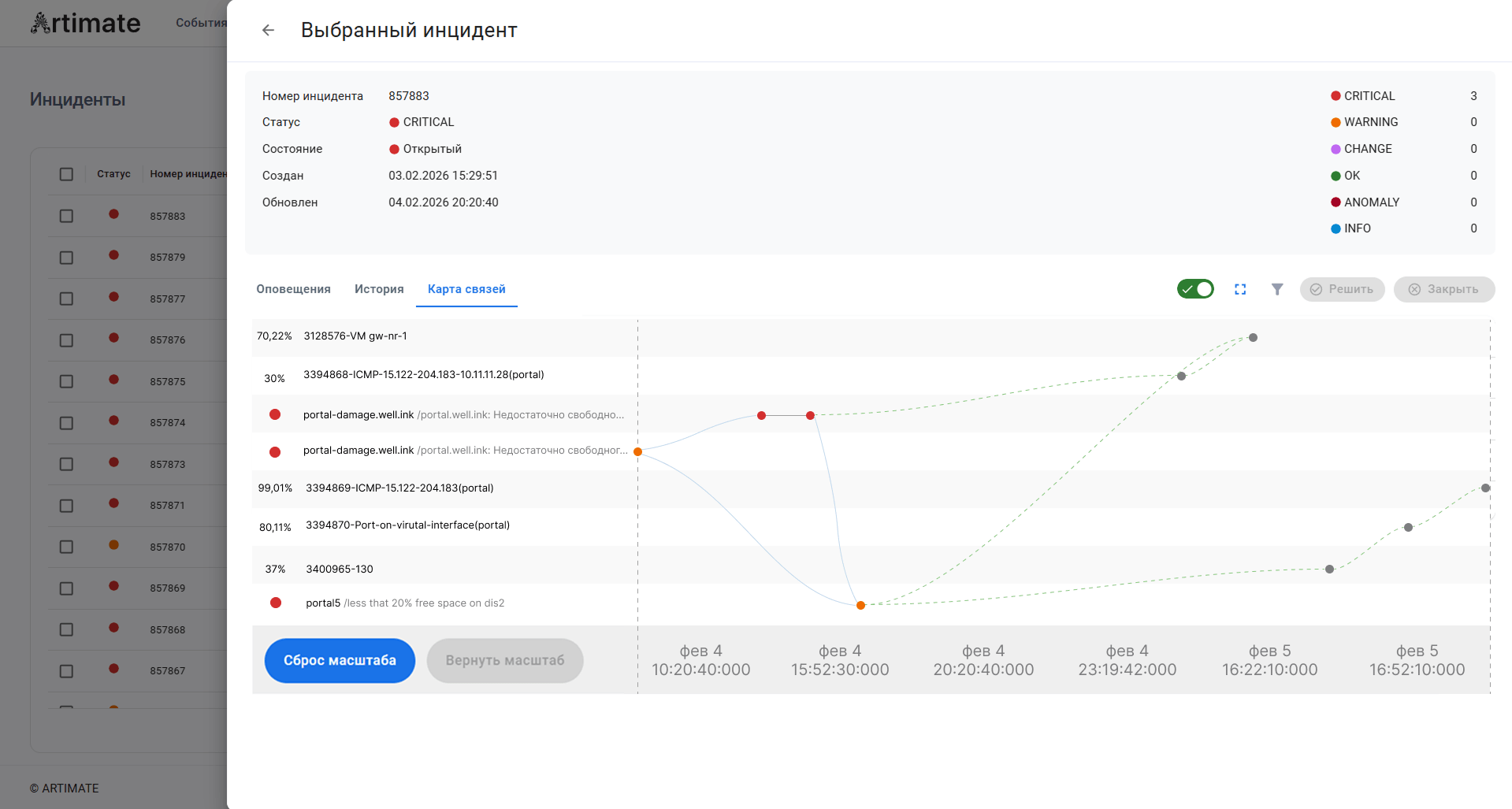 Artimate использует машинное обучение для анализа исторических данных и паттернов в реальном времени, прогнозируя инциденты и системные сбои до их влияния на бизнес-сервисы. Вместо реактивного «тушения пожаров» — проактивный мониторинг